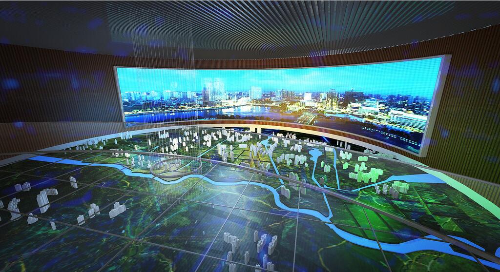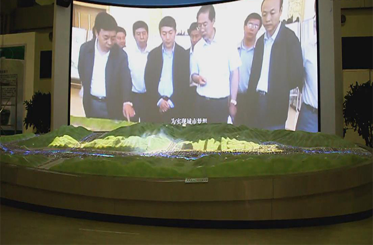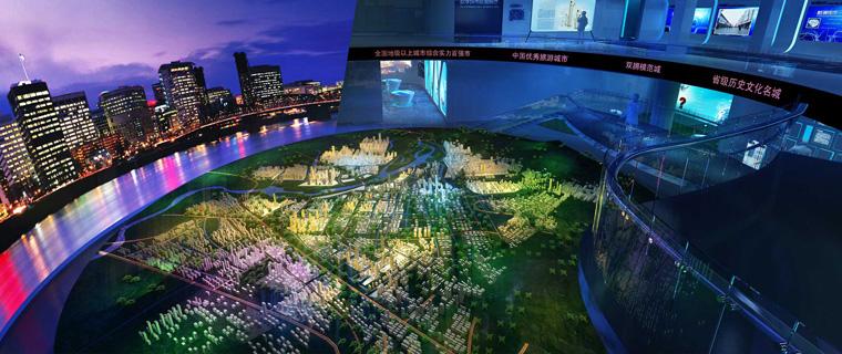能展現(xiàn)城市中的建筑物、軌道交通、花草樹木、四季變化以及未來發(fā)展等信息,沙盤制作技術(shù)人員利用計(jì)算機(jī)中的沙盤制作軟件結(jié)合沙盤技術(shù)制作而成的內(nèi)容,通過投影投射到屏幕上展現(xiàn)。